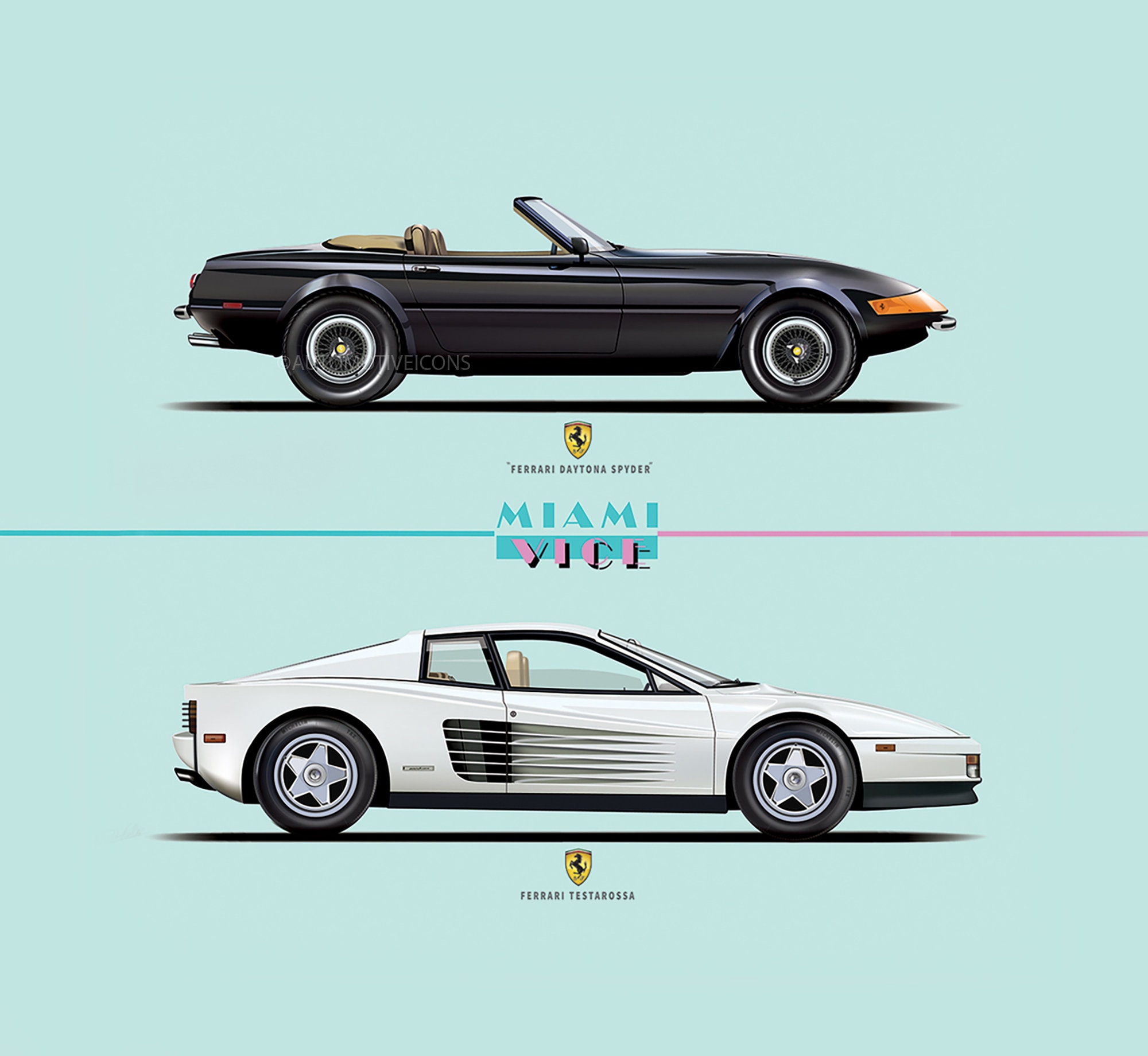 . The cars in Miami Vice mainly involve the Ferrari Daytona Spyder and the Ferrari Testarossa, but also include other automobiles driven by the characters on the show Chassis #063259 was one of two Metallic Black "Flying Mirror" Testarossa examples given to Universal Television by Ferrari.